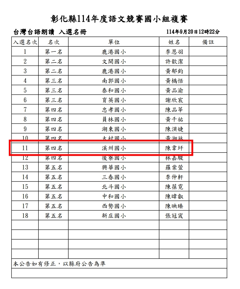 恭喜 #陳韋圲 同學,參加彰化縣114年度語文競賽國小組複賽,榮獲台灣 #台語朗讀 #全縣第四名 的佳績,師生仝賀。
