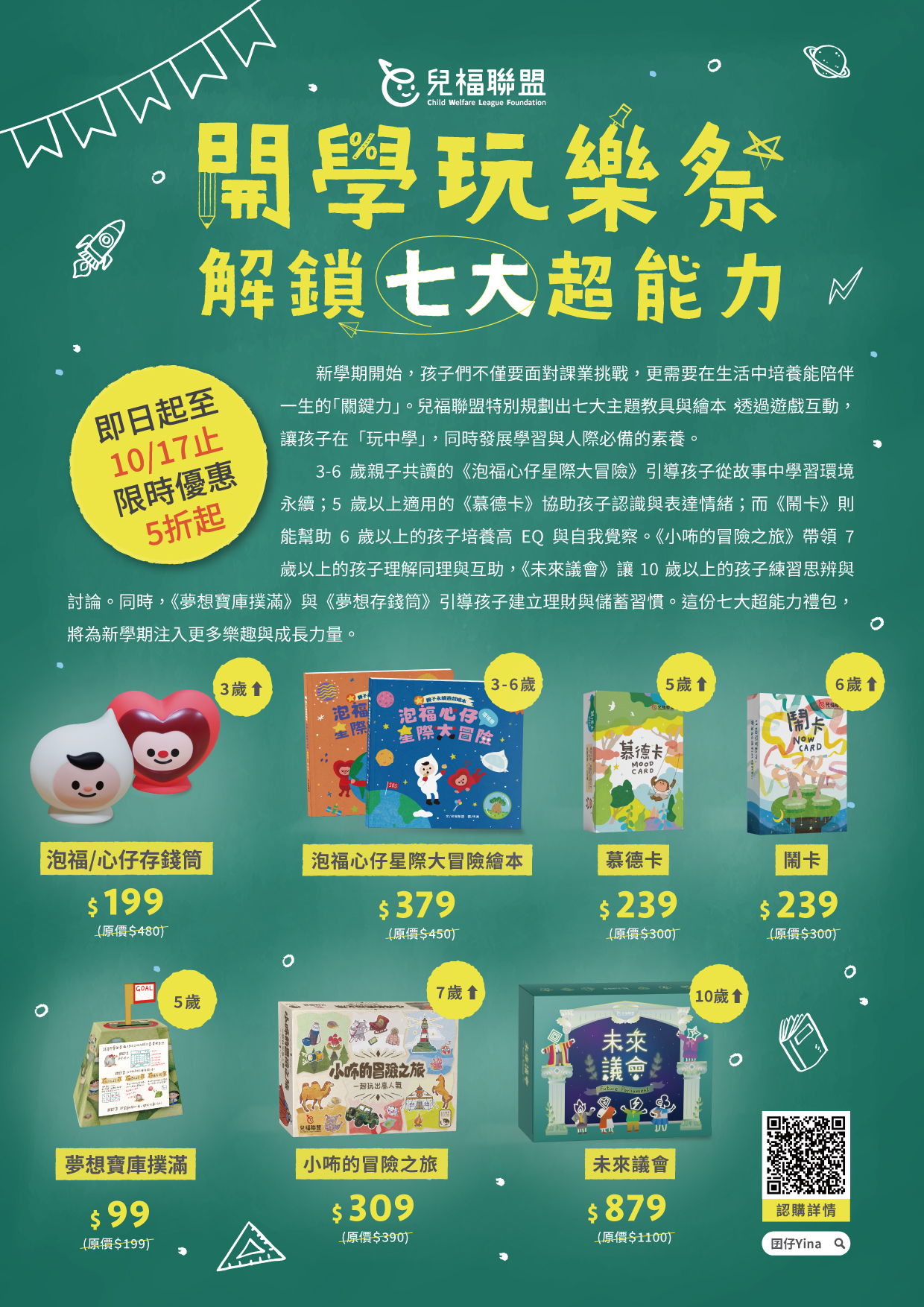 為推廣兒少多元學習,財團法人中華民國兒童福利聯盟基金會推出「開學玩樂祭·解鎖七大超能力」成長禮包