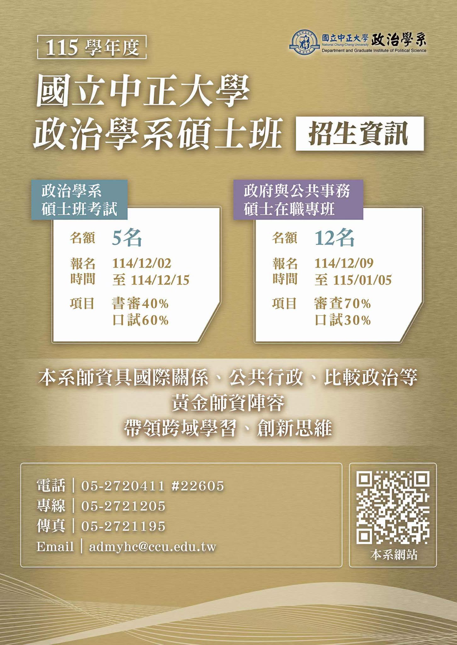 | 四、 | 為擴大招生,本碩士在職專班免筆試,以資料審查及口試甄選,提供更寬廣的入學管道。敬請惠予協助鼓勵所屬單位同仁報考,並公告周知。 |